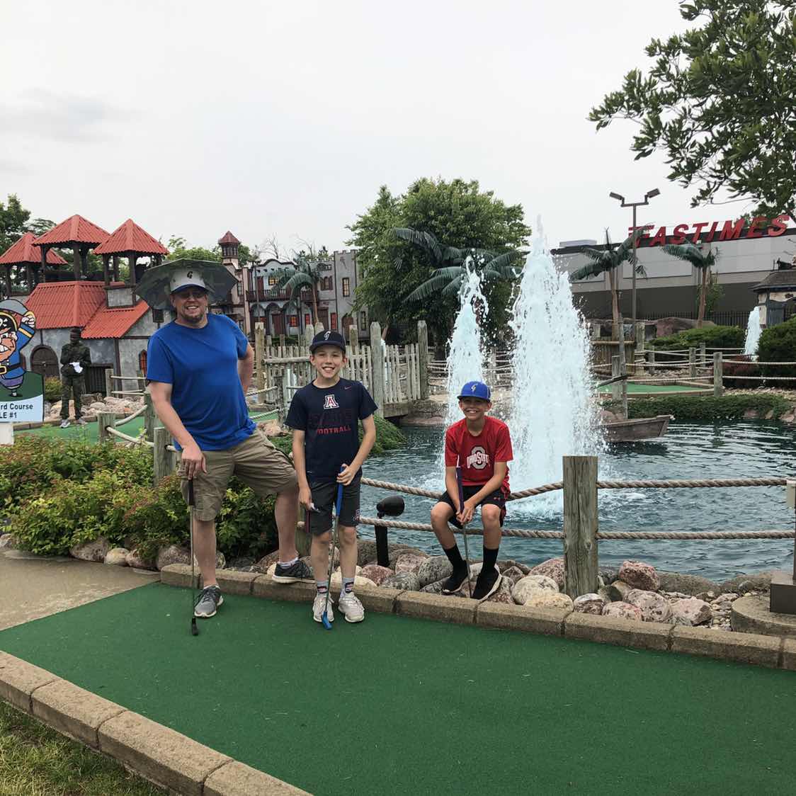 20190621 - Up in the am and Bryce's Mom got J home and D ran him over for his last day of Driver's Ed, he passed the test, only missed 1 question! Now he needs to schedule his in car driving. LG&I headed to the ball field for a good day + 2 Ws. G got a triple during one of his at bats. After the games we didn't want to hang out in the hotel so we grabbed Owen and headed out for some mini-golf, Owen somehow beat us all despite my 4 hole in ones! We then got some ice cream and swung by a yard art extravaganza on the way back to the hotel where the team got to swim and hang out while the adults hung out in the lobby.
