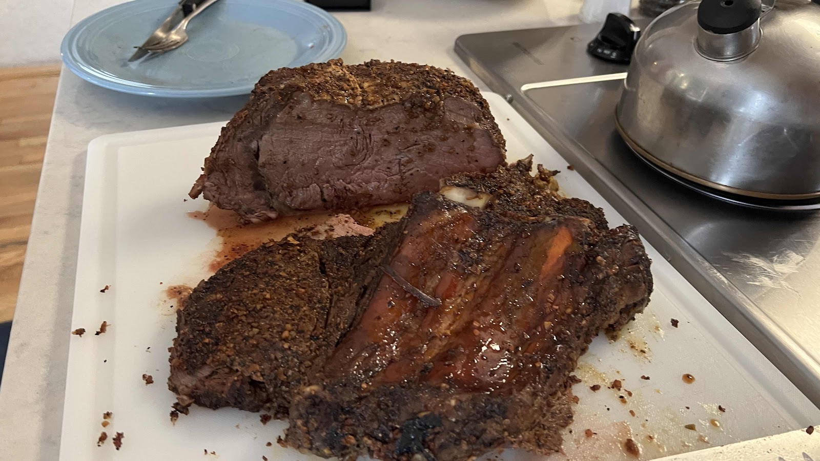 20250325 - Up and to the desk. Got the prime rib roast in the smoker and a lot of other stuff done today. Had the window guys out to look at 3 of our windows with moisture between the glass and got those ordered. We had a guy from Rhino-Shield come out and give us an estimate this afternoon, $15k to pressure wash, prime and seal the house 😮 Got the prime rib out of the smoker and let it sit while L made some sides. IT WAS AMAZING. Hung out watching TV with L.
